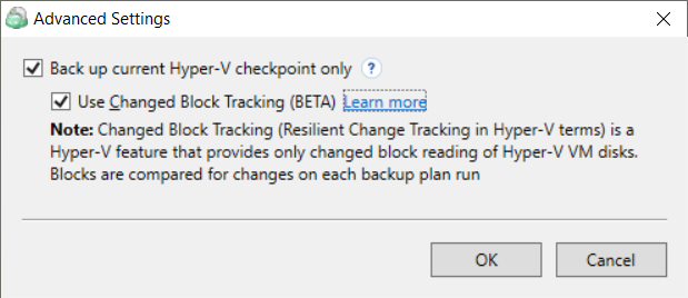 Changed block tracking (Resilient Change Tracking in Hyper-V terminology) is a feature that implements changed block tracking for Hyper-V VM disks. Changed Block tracking can be enabled by users to optimize the backup procedure and save backup data reading time. Once the Changed Block Tracking option is enabled, only changed blocks of a virtual machine disk (vhdx) between two backup operations are read.