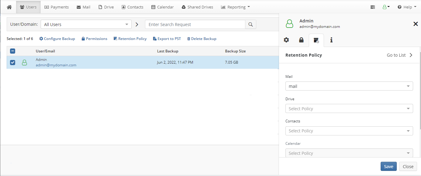 Select existing retention policies for the services to set them as default. This default retention policy will be applied to existing users without configured retention settings and for all new users. Users with configured retention settings will not be affected. To apply this retention policy to all users (including users with configured retention settings), select Apply to all users checkbox.