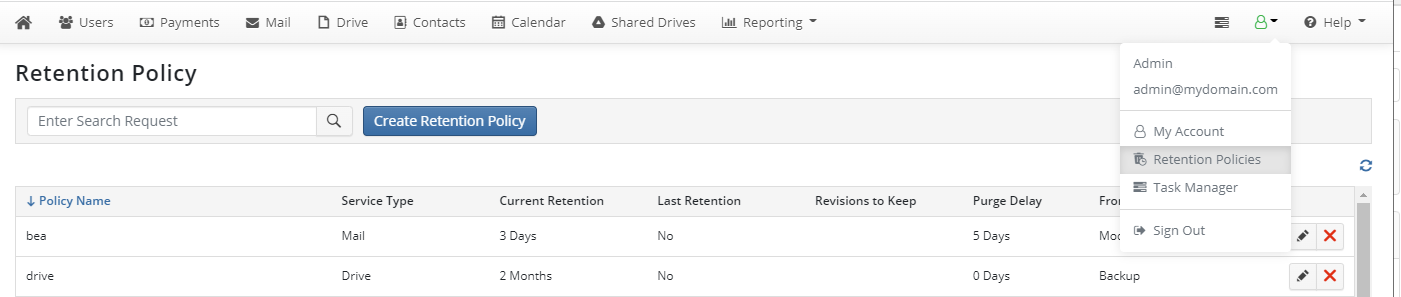 To edit a retention policy, in Account menu to the right of the horizontal menu bar click Retention Policies.