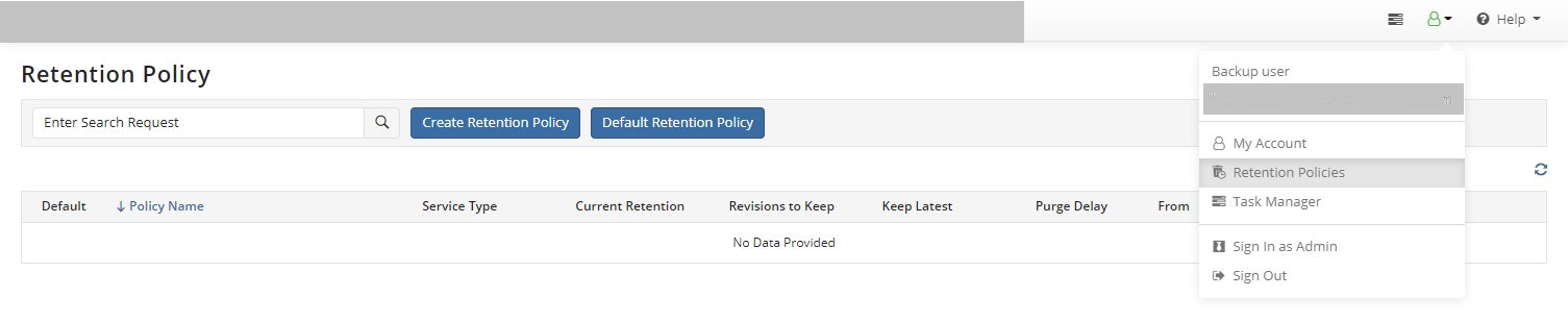 To create a retention policy, in Account menu to the right of the horizontal menu bar click Retention Policies.