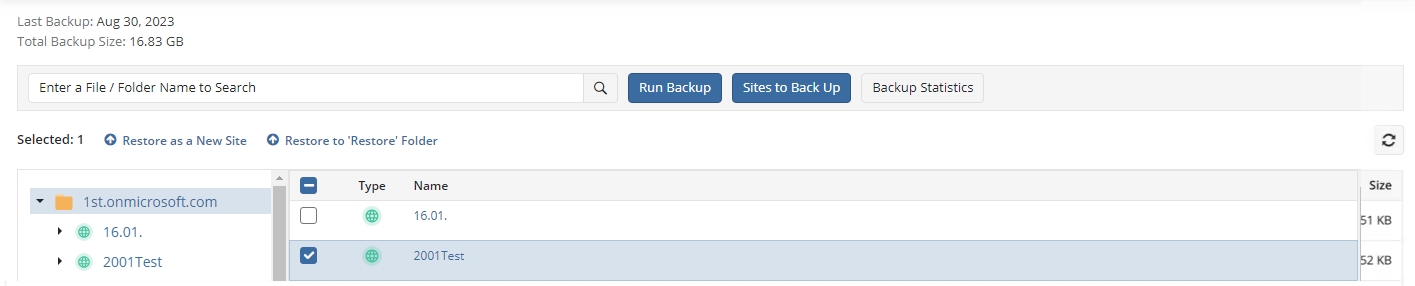 Click Sites to Back Up button to select what sites will be backed up. Save your selection. To start the urgent backup for all or for selected items, select all or specific items to backup, then click Run Backup. You will be notified about the backup job creating event.