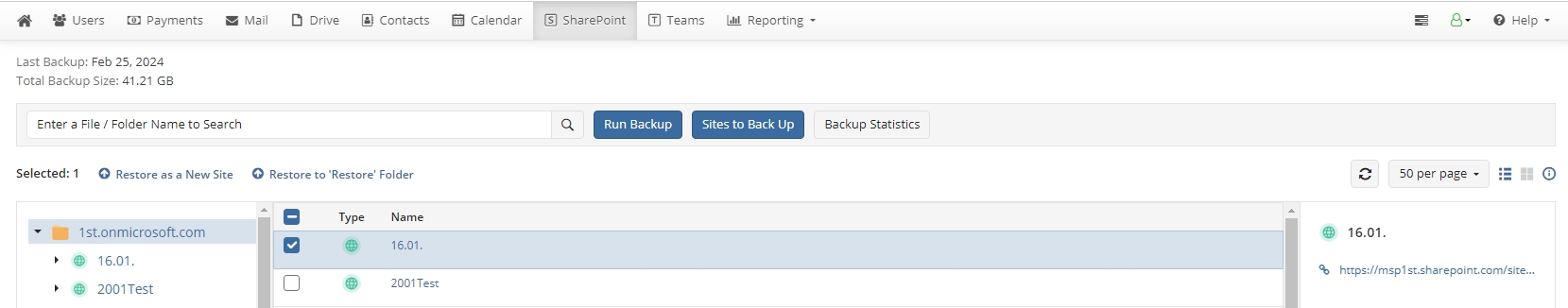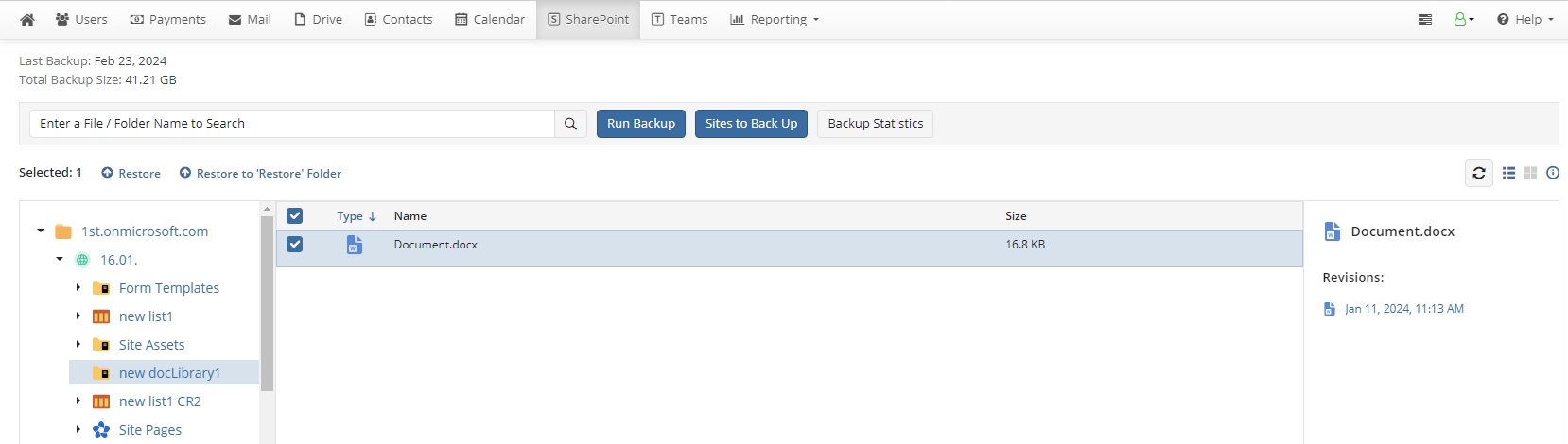 To restore a single item from SharePoint Document Library or Teams files located in teams' documents, select SharePoint in the horizontal menu bar.