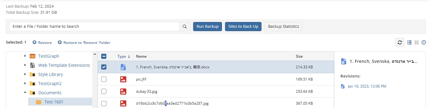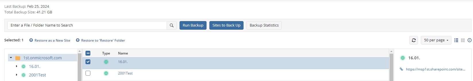 To configure the backup settings for SharePoint sites, document libraries, Teams files, or to run an backup, select SharePoint in the horizontal menu bar. By default, SharePoint backup runs automatically up to three times per day. To initiate the backup for all or for selected documents or files, select all or specific items to backup, then click Run Backup. You will be notified about the backup job creating event. As soon as backup is completed, the backed up sites can be viewed.