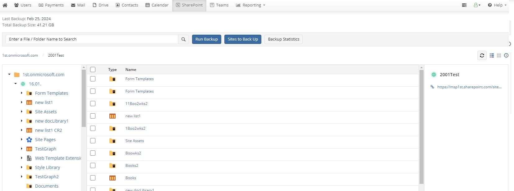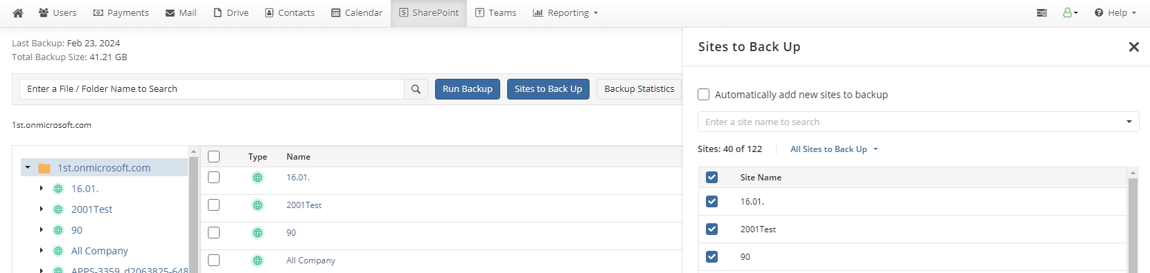 To back up SharePoint sites, site pages, site assets, document libraries, as well as Teams files stored in SharePoint, make sure you have a valid SharePoint/Teams/Shared Drives license. A SharePoint/Teams/Shared Drives license covers all SharePoint sites, including Microsoft Teams files for a tenant.