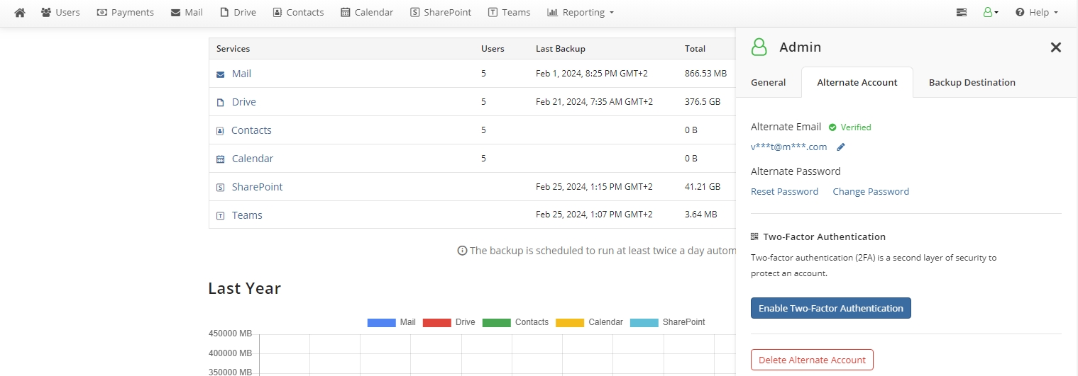 Specify an alternate email address. For security reasons, it is required for deleting data of domain users and adds another security layer to the accessibility of the backup content. It is recommended to use a strong password for this alternate email. Save your contact info to apply. Visit your mailbox to verify the alternate email address as described below.