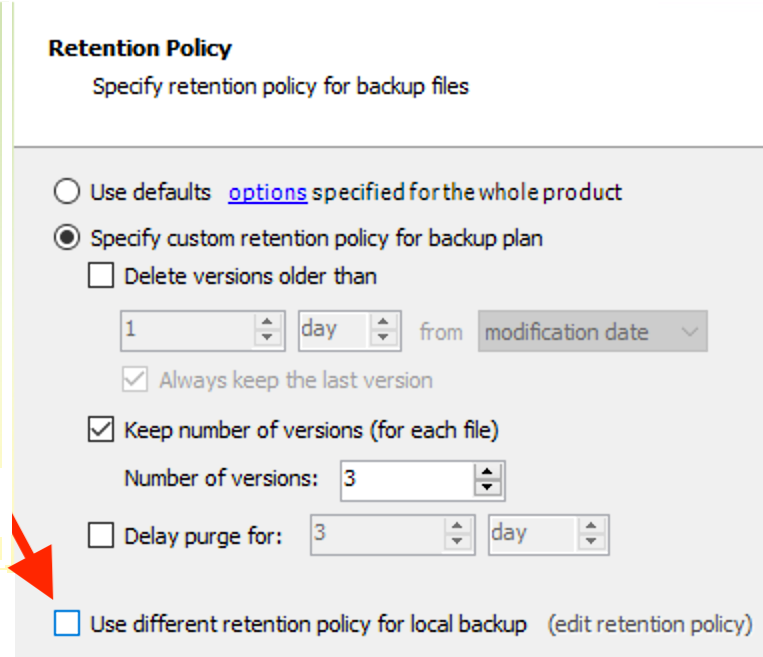 If you're creating a Hybrid backup plan, TrueSecure Backup will allow you to configure a separate retention policy for both the local and the cloud storage. In this case the Retention Policy step of the Backup Wizard will feature a checkbox entitled Use different retention policy for local backup. Click it.