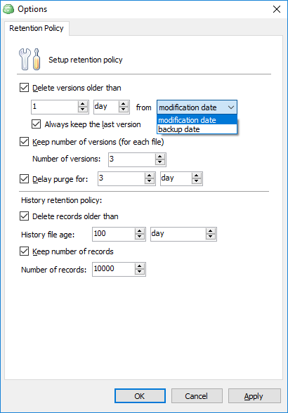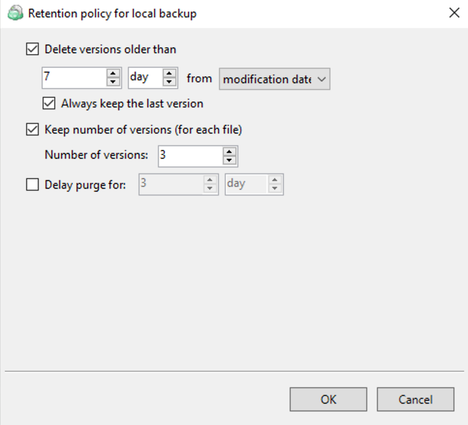 You can make a backup service delete file versions that were modified or uploaded to your backup storage more than a certain number of days ago. When enabling this option, you can also make the backup service always keep the last version of each file regardless of their modification or upload date.