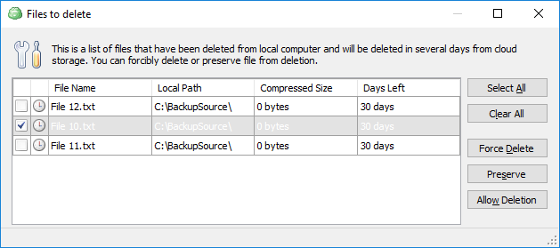 You can specify a time period for which locally deleted files should be maintained in the backup storage before being purged. After these files become removed from the backup storage, you will no longer be able to restore them.