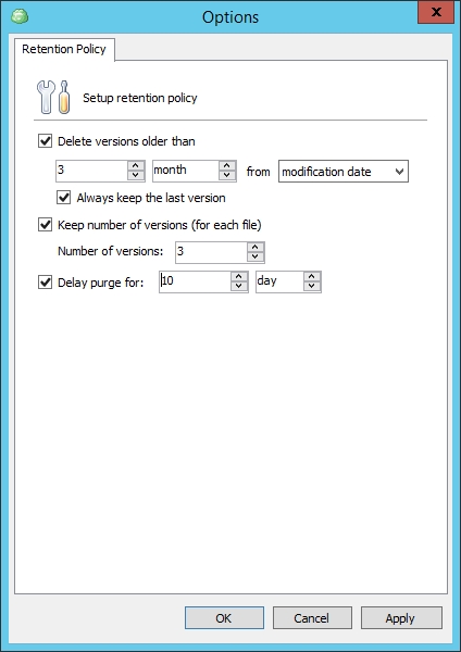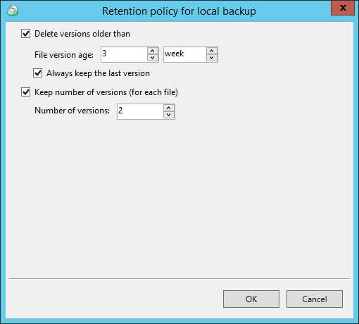 You can make a backup service delete versions of disk images that were uploaded to your backup storage more than a certain number of days ago. When enabling this option, you can also make the backup service always keep the last version of each image regardless of its modification or upload date.