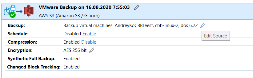 Note that some backup plan parameters you can edit without a backup wizard. The editable parameters are marked with the Pencil icon next to them. To edit, click on this icon