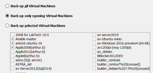 Note that if you switch the backup option from the Back up selected Virtual Machines to any other, the previously made selection is kept for the case if you change your mind and select back the Back up selected Virtual Machines option, but the selected option will be applied regardless the VM selection. An example below shows the case when all running VM will be included in the backup plan despite a previously made selection