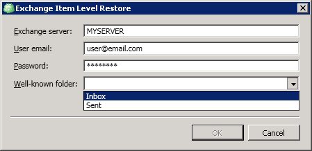 Specify the Exchange Server name and credentials, then select a folder the selected item to be restored.